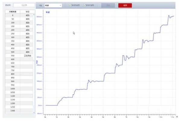 轉(zhuǎn)速控制精度測(cè)試:對(duì)具有轉(zhuǎn)速控制功能的驅(qū)動(dòng)電機(jī)系統(tǒng),在10%-90%最高工作轉(zhuǎn)速范圍內(nèi),均選取10個(gè)不同的轉(zhuǎn)速點(diǎn)作為目標(biāo)值,按照某一轉(zhuǎn)速目標(biāo)值設(shè)定驅(qū)動(dòng)電機(jī)控制器或上位機(jī)軟件,驅(qū)動(dòng)電機(jī)由靜止?fàn)顟B(tài)直接旋轉(zhuǎn)加速,并至轉(zhuǎn)速穩(wěn)定狀態(tài),計(jì)算實(shí)際轉(zhuǎn)速與目標(biāo)轉(zhuǎn)速的差值,或?qū)嶋H轉(zhuǎn)速與目標(biāo)轉(zhuǎn)速的偏差占目標(biāo)轉(zhuǎn)速值得百分?jǐn)?shù),此值即為這一轉(zhuǎn)速目標(biāo)值對(duì)應(yīng)的轉(zhuǎn)速控制精度。